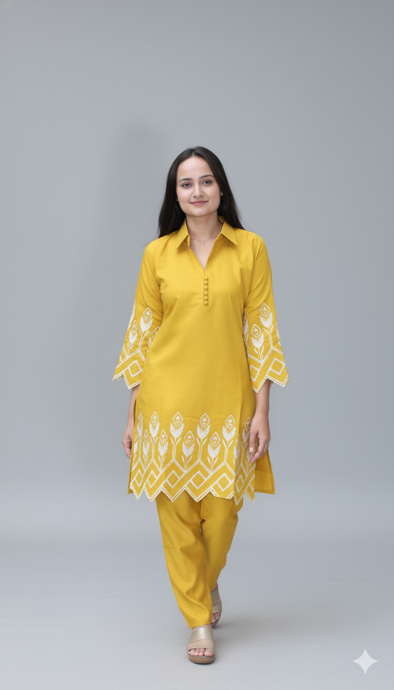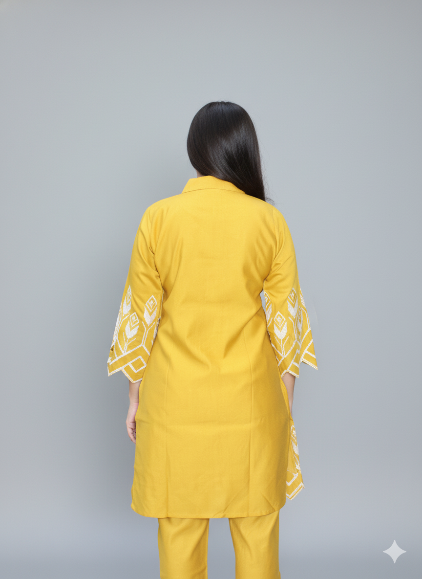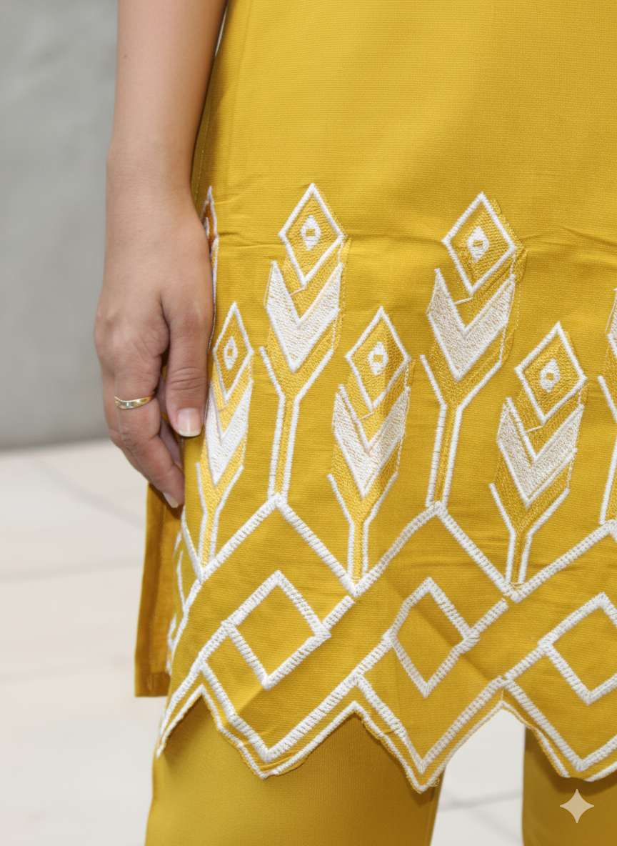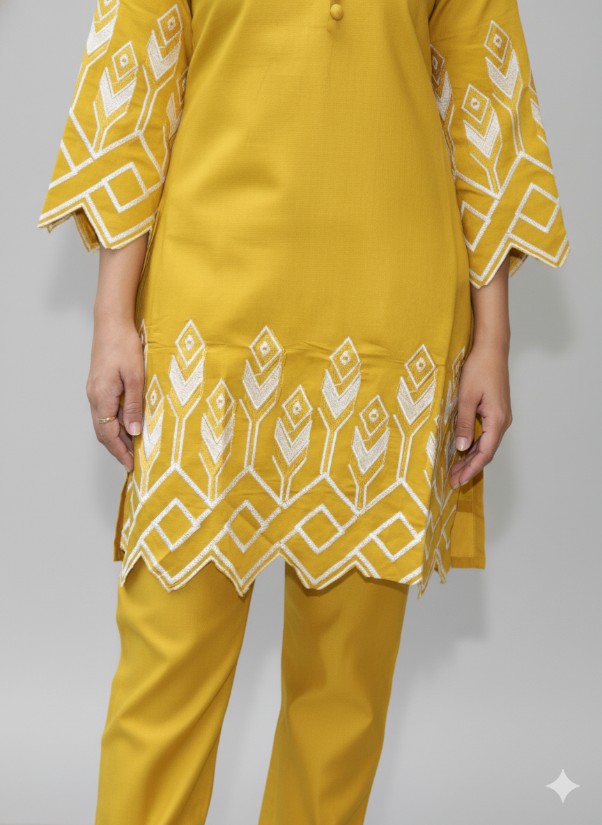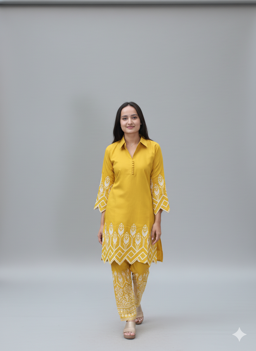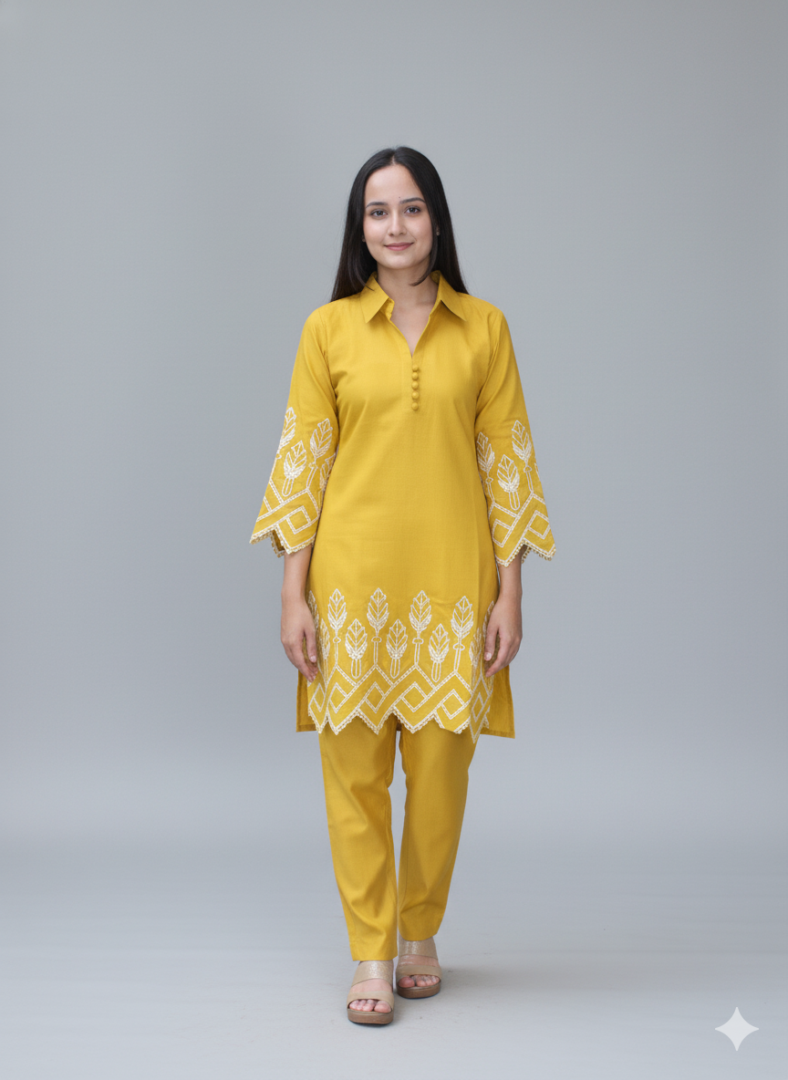 Women Mustard Embroidered Cut Design Cottton Co-Ord Set