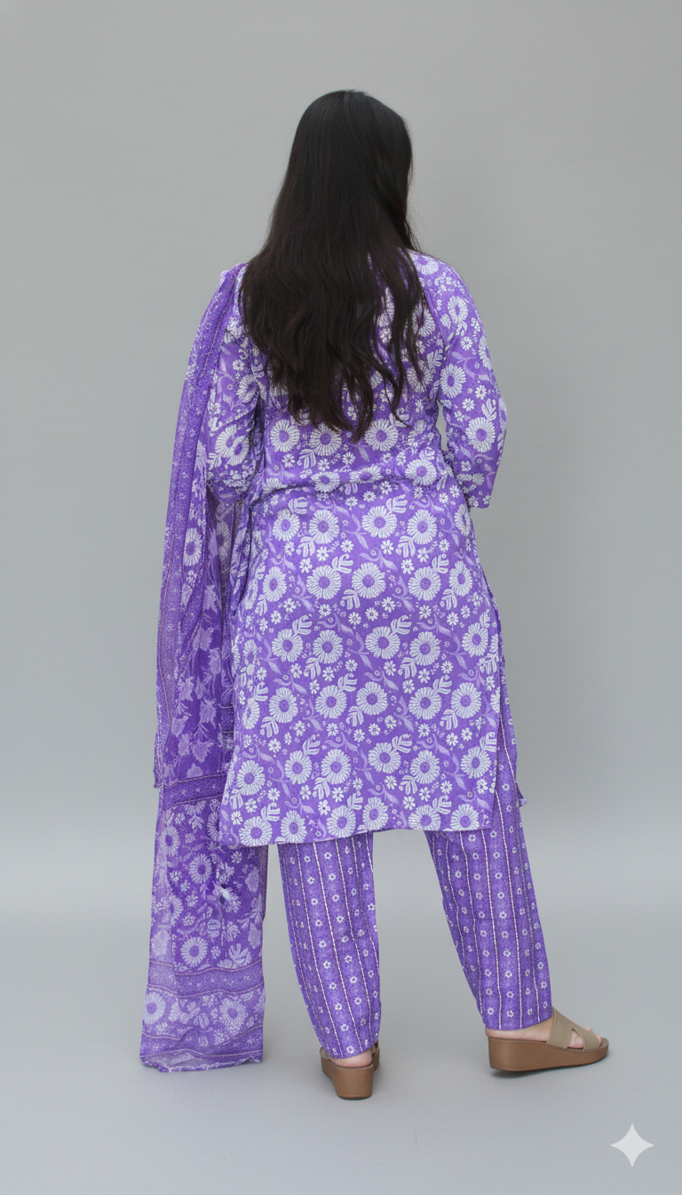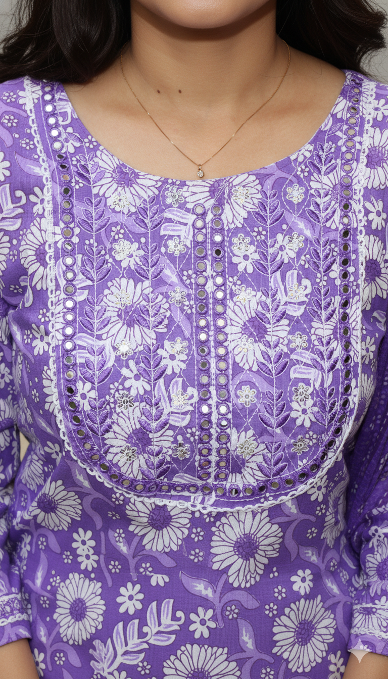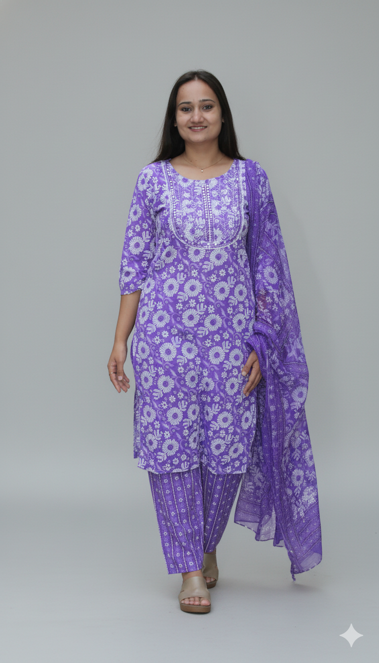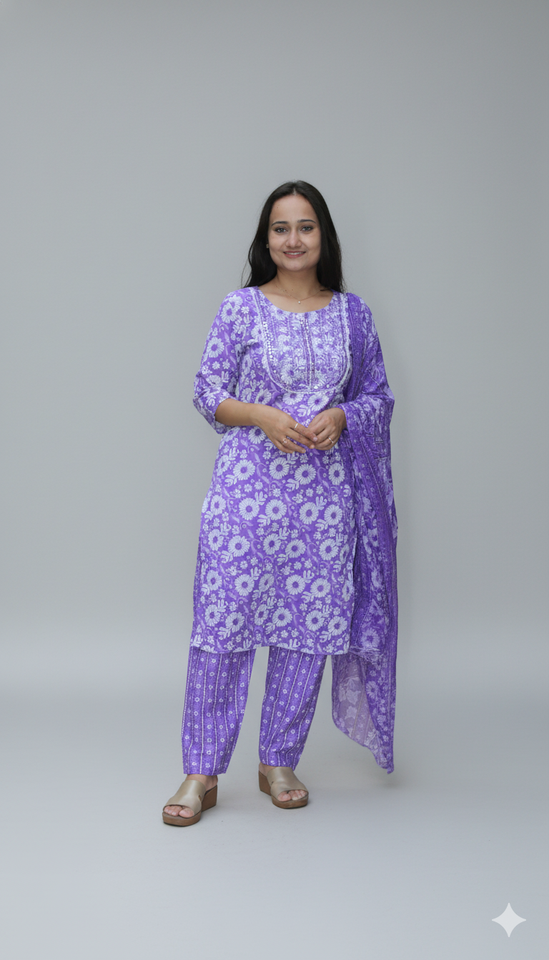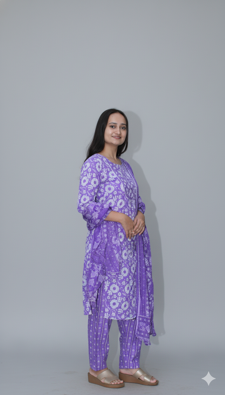 Women Purple Cotton Printed Kurta Set With Dupatta