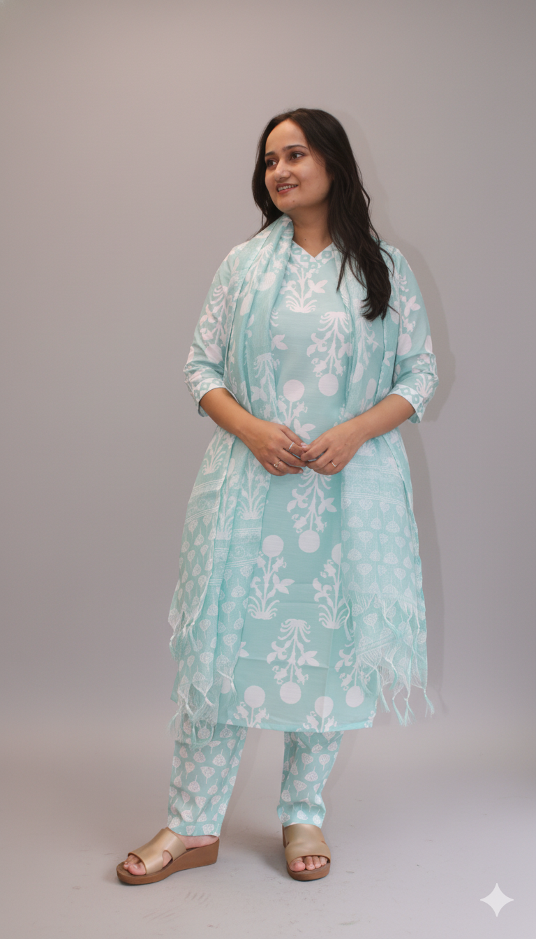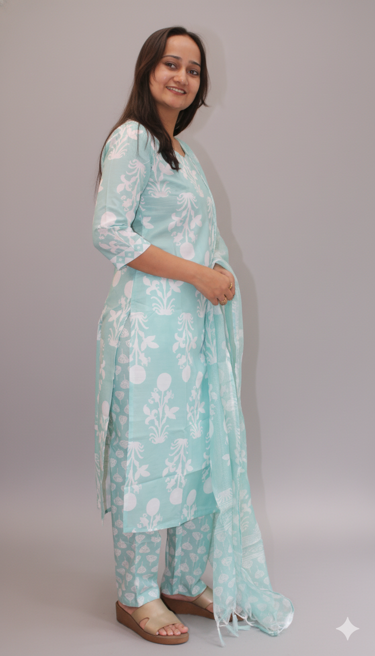 women sea green & white printed kurta set with dupattaWomen Sea Green & White Printed Kurta Set With Dupatta