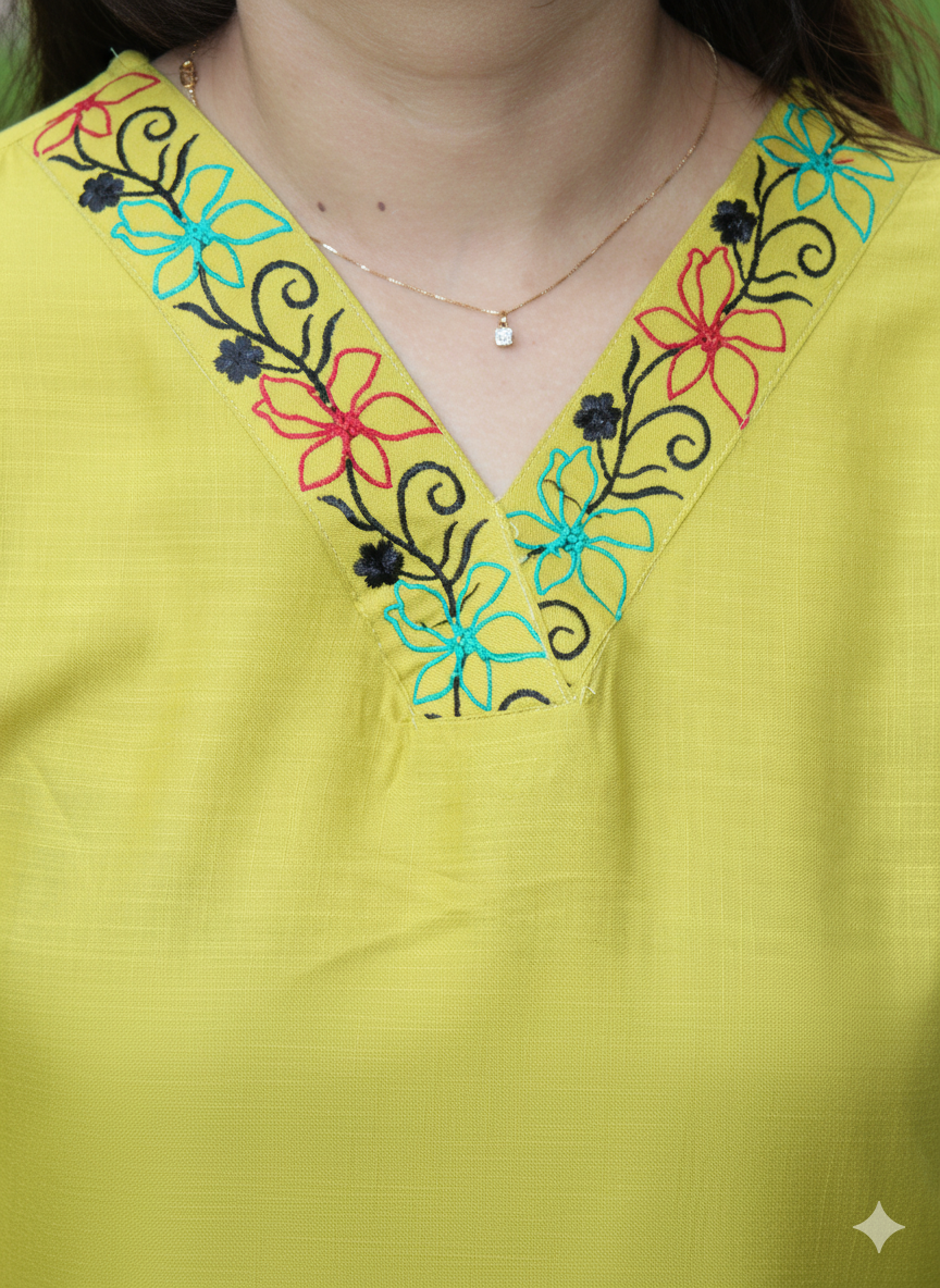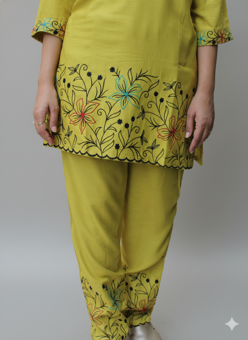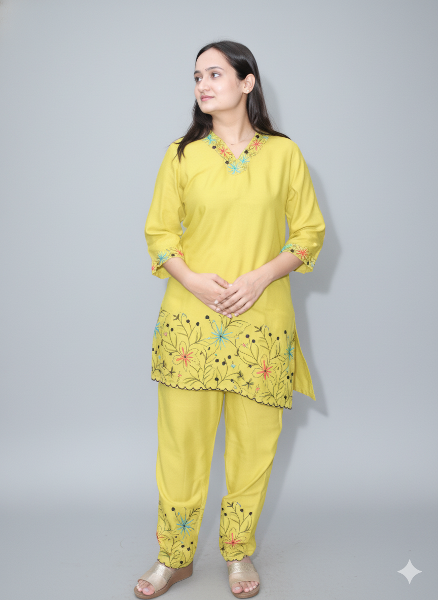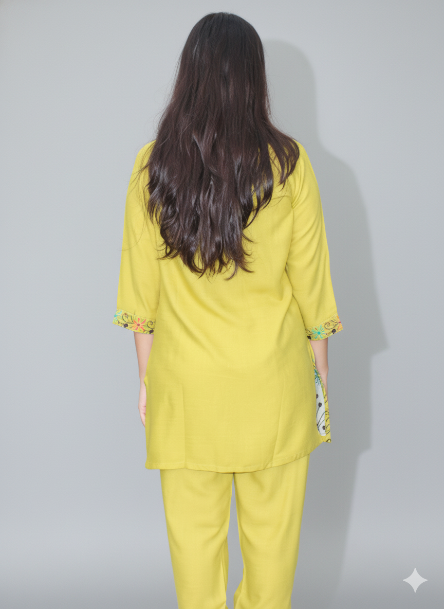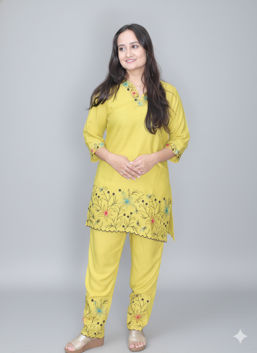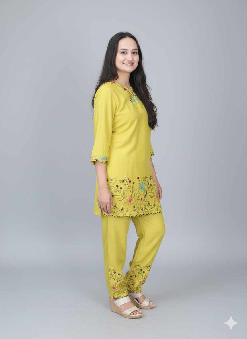 Women Yellow Embroidered Co-Ord Set Elegant Summer Two-Piece Outfit